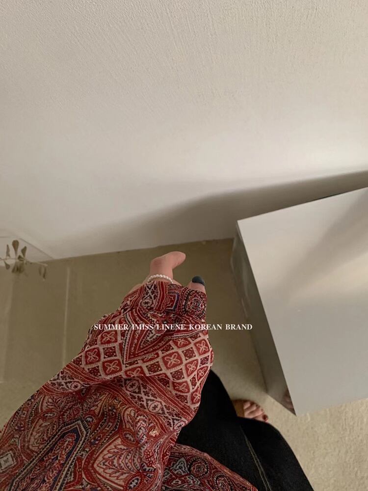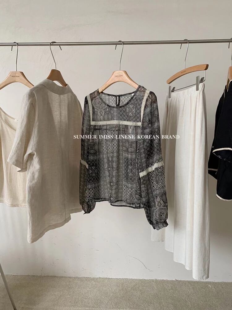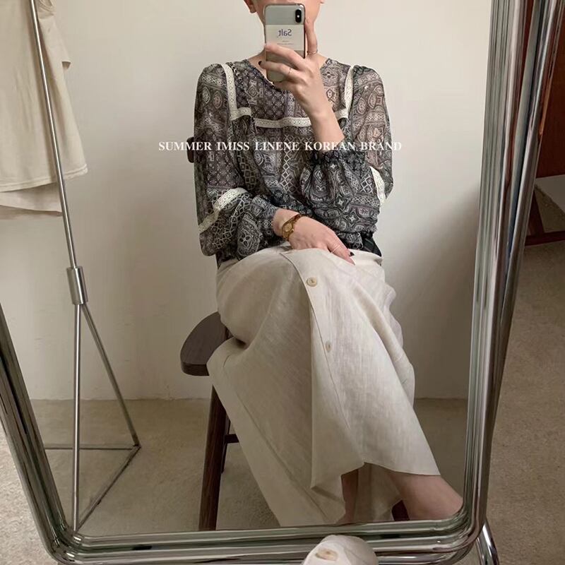 薄手カラーシャツ レディースサマーカジュアルスタンダードプリント柄ラウンドネックプルオーバー トップス ロング レトロ 夏物 Oネック ビッグFスモールZ韓国4009839449