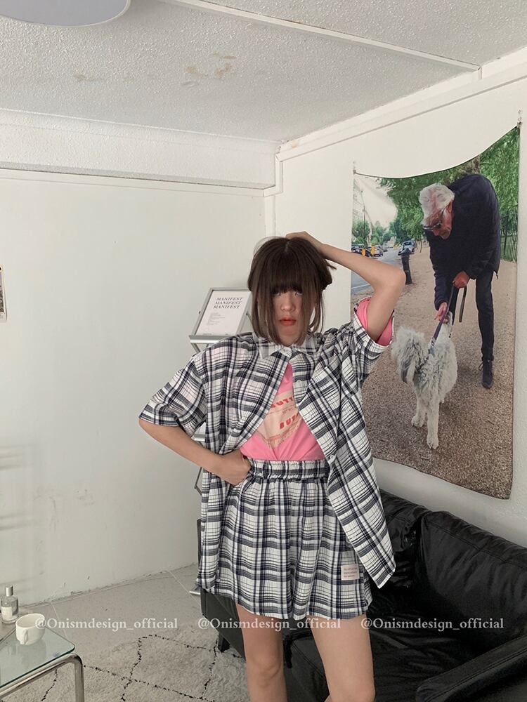 ルーズ格子柄サマーカラー薄手シャツ ショーツ レッド 夏物 ブルマー ビッグFスモールZ韓国83521367539