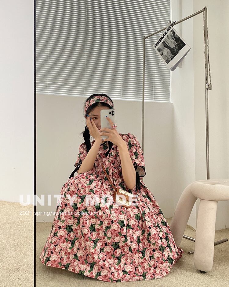 ロングフローラルドレス サマールーズレーススリーブAライン 夏物 花柄 ビッグFスモールZ韓国22798589702