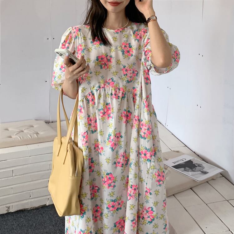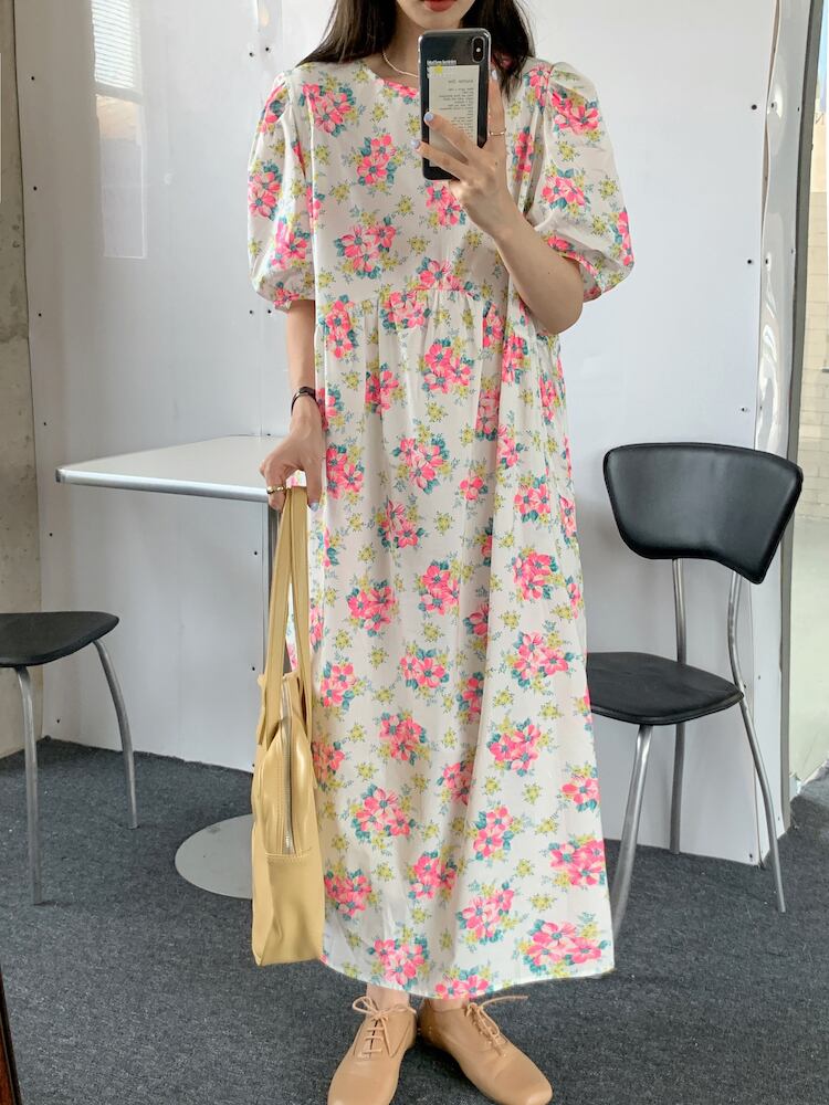 カラーラウンドネックスリーブドレス サマースタイルプリーツウェストルーズ薄手Aラインスカート 夏物 Oネック ビッグFスモールZ韓国3768522374