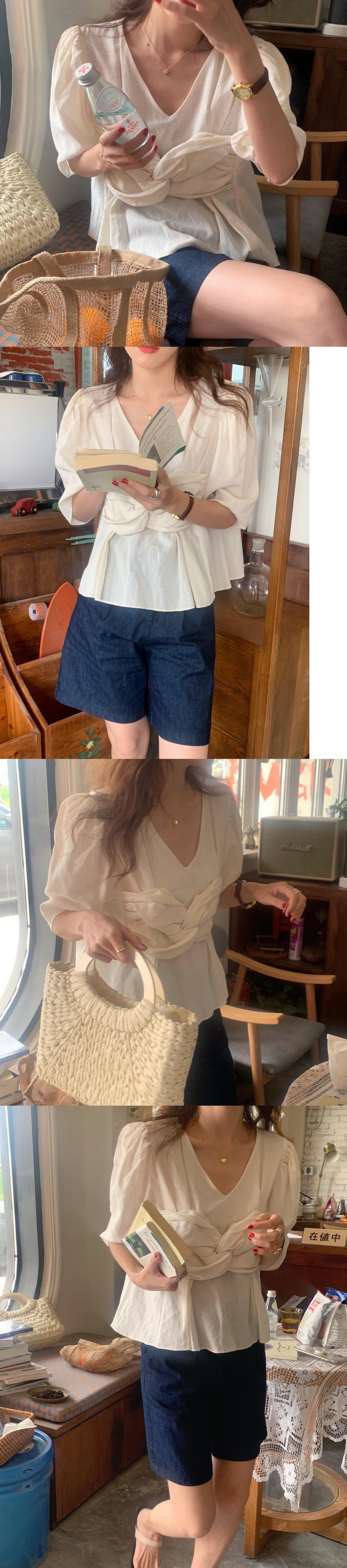 リボンVネック薄手スタイルシャツ レディースサマーソリッド カラートップス 夏物 ソリッドカラー ビッグFスモールZ韓国74214013025