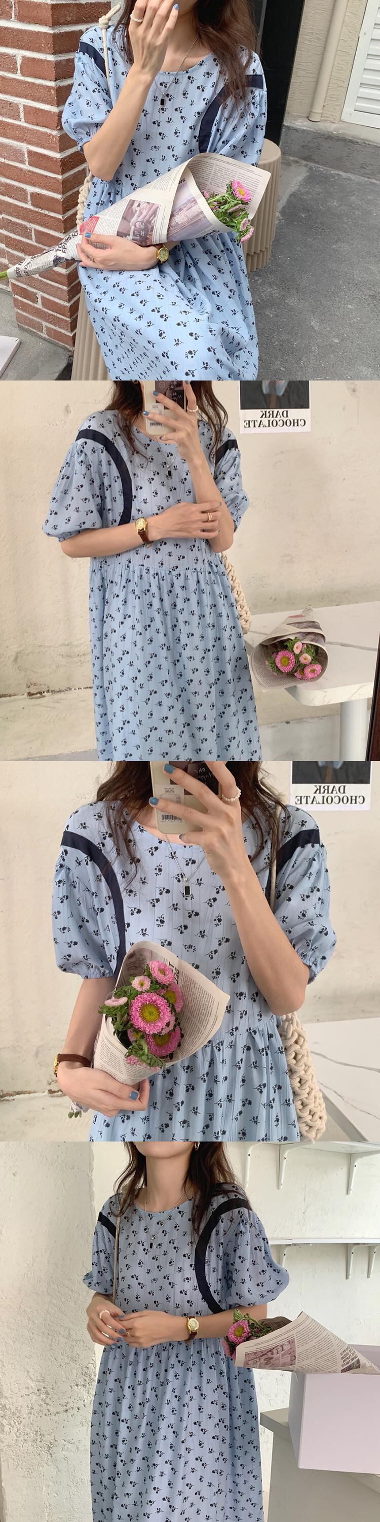 スリーブフローラルドレス サマーラウンドネックAラインロングスカート 夏物 花柄 Oネック ビッグFスモールZ韓国89391702366