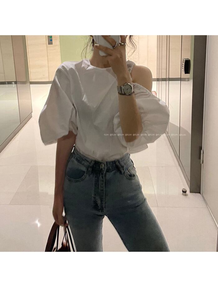 スリーブシャツ サマースタイルプリーツルーズトップス ランタンスリーブ 夏物 オフショルダー ビッグFスモールZ韓国21078890317