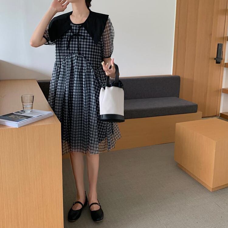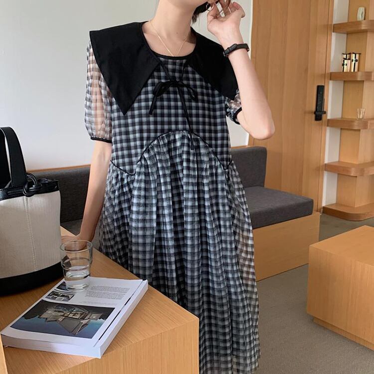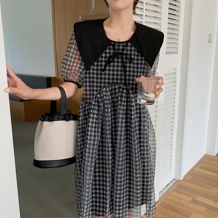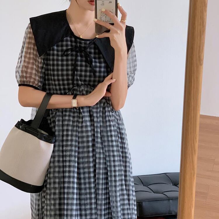 カラー格子柄ドレス サマーAラインウェストプリーツ薄手スカート レース 夏物 レースアップ ビッグFスモールZ韓国18564950915