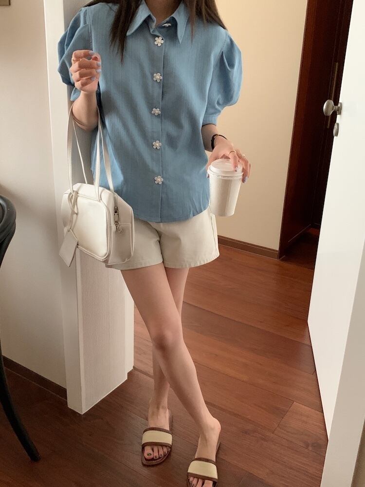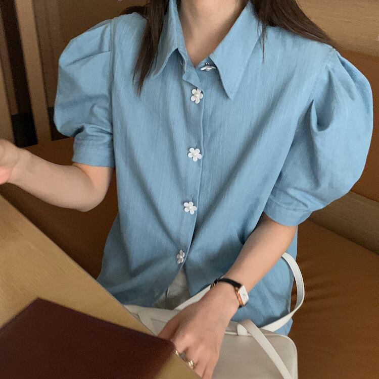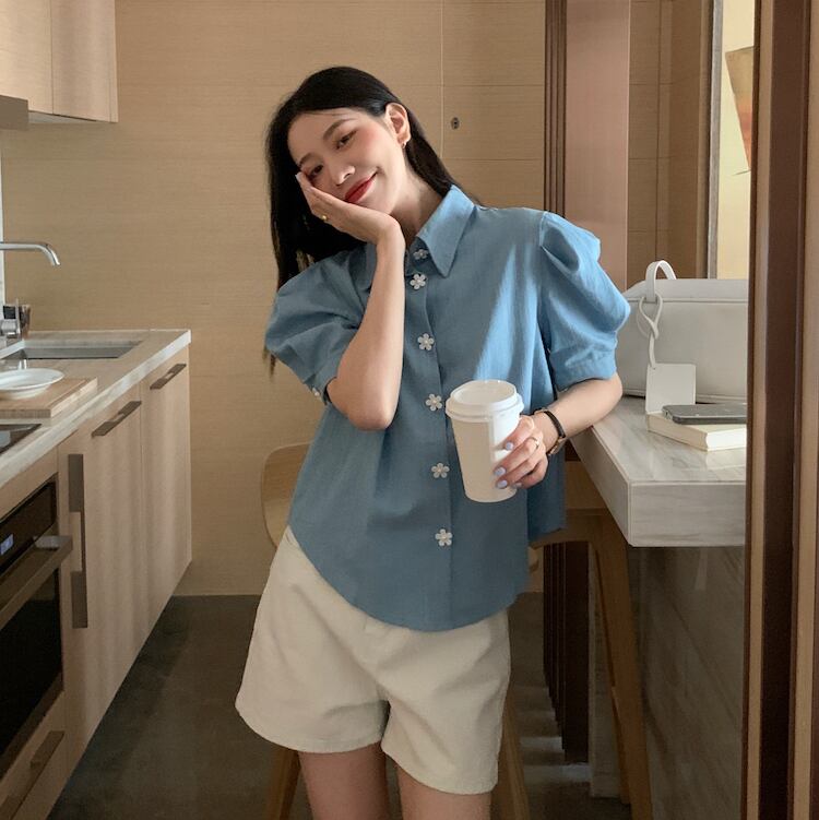 スタイルシャツ サマールーズカラーFlowerデザイン バックル ベルスリーブ 夏物 フラワーデザイン ビッグFスモールZ韓国13063943781