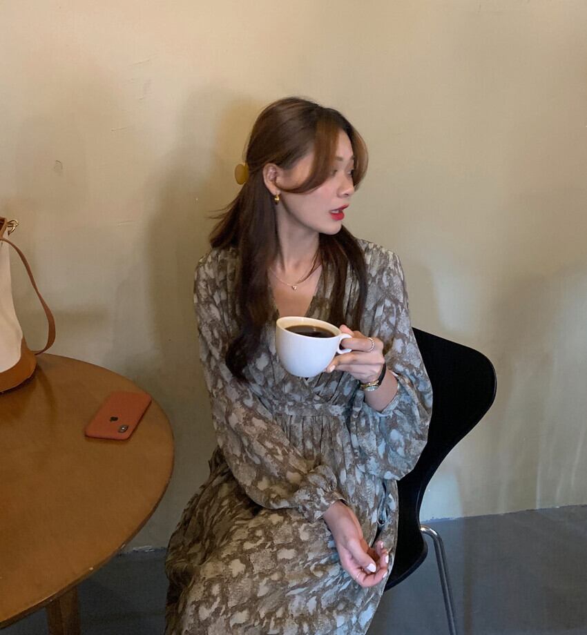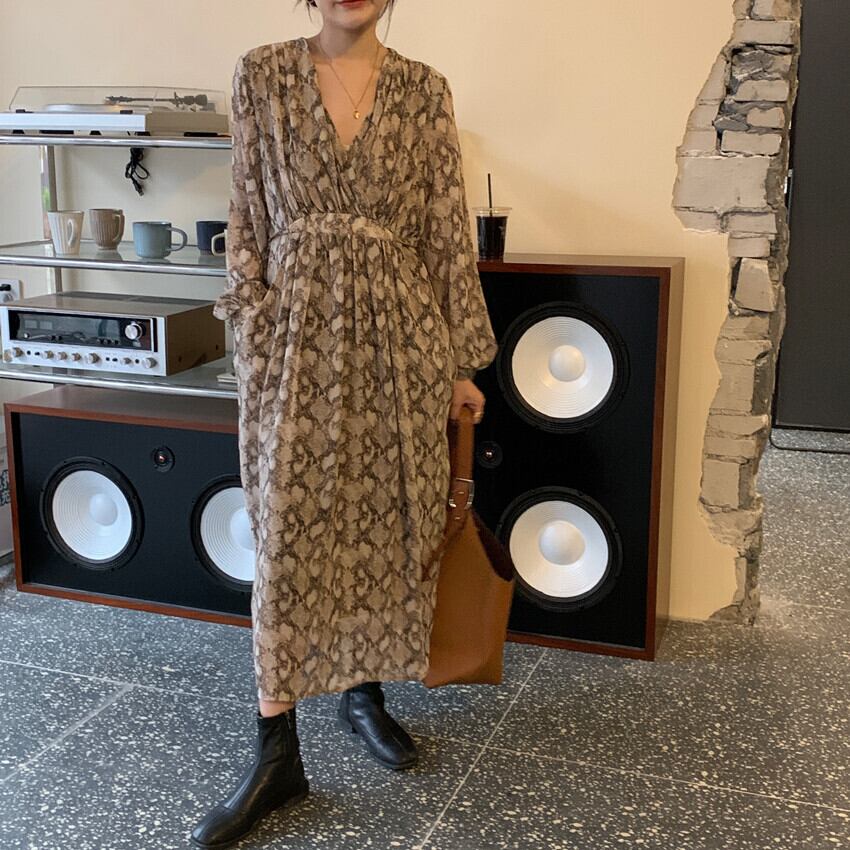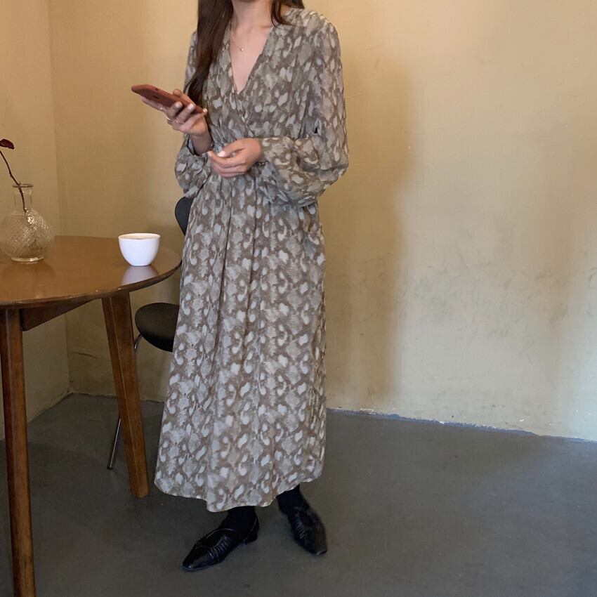 ポケットパターンVネックドレス ルーズロングスカート オータムレディース 秋物 ビッグFスモールZ韓国18995887583