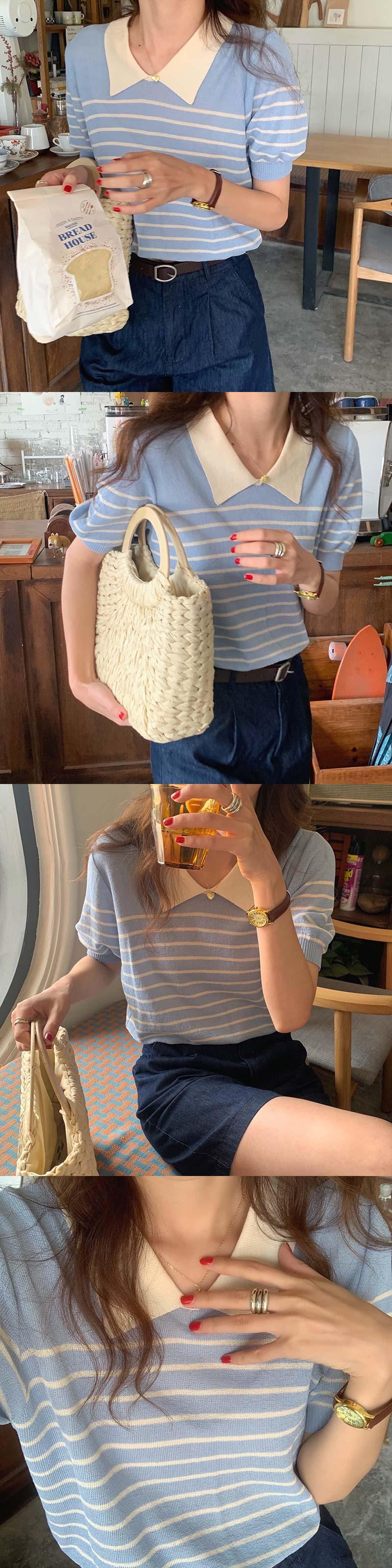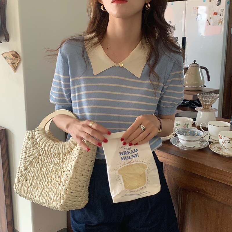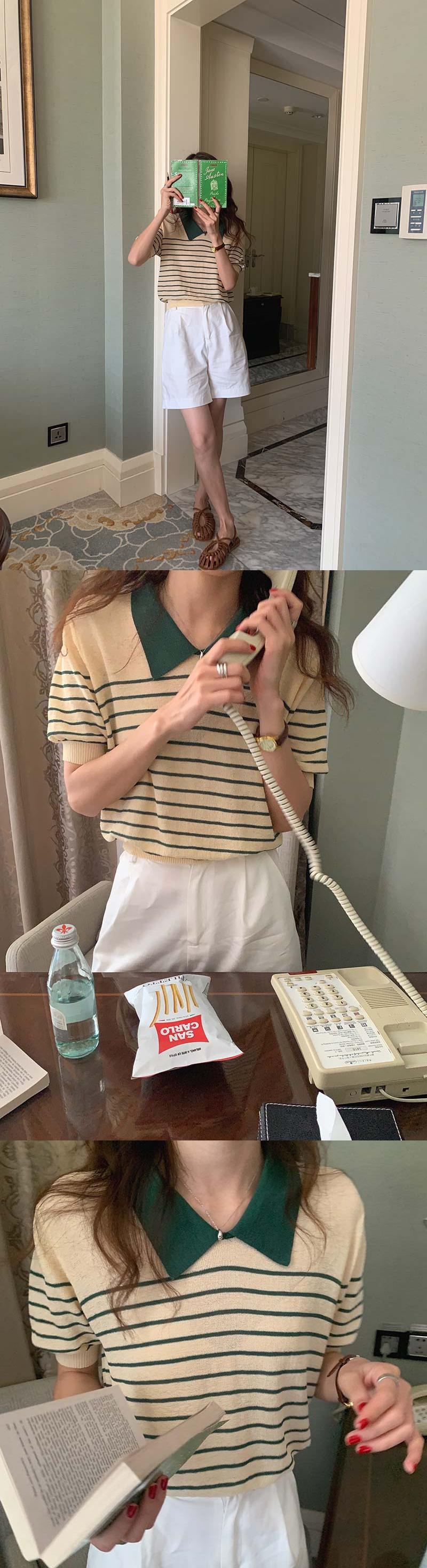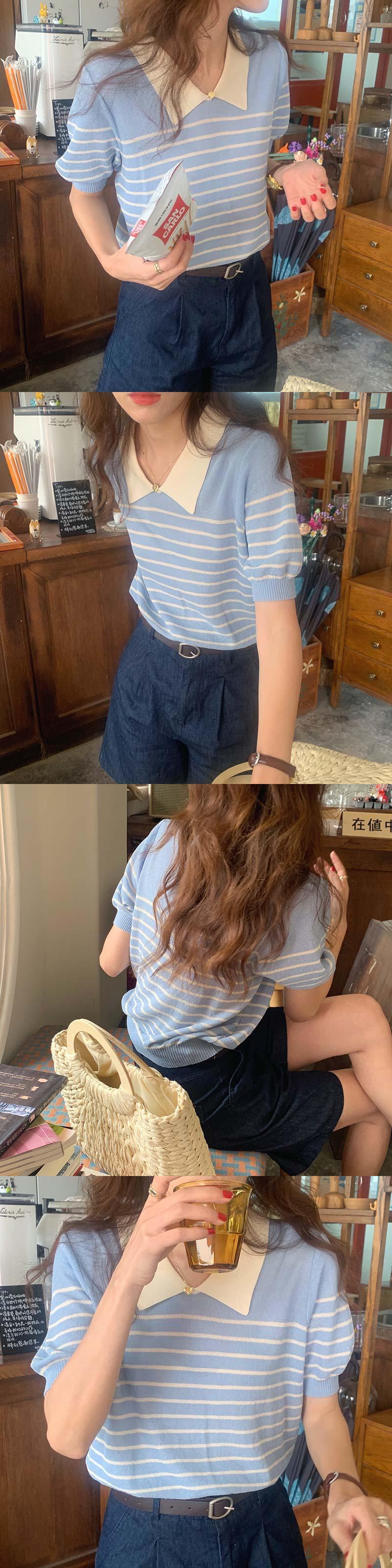 ニットストライプカラーシャツ サマールーズスリム半袖スリーブウェスト ショート ハーフスリーブ 夏物 ビッグFスモールZ韓国44474124573