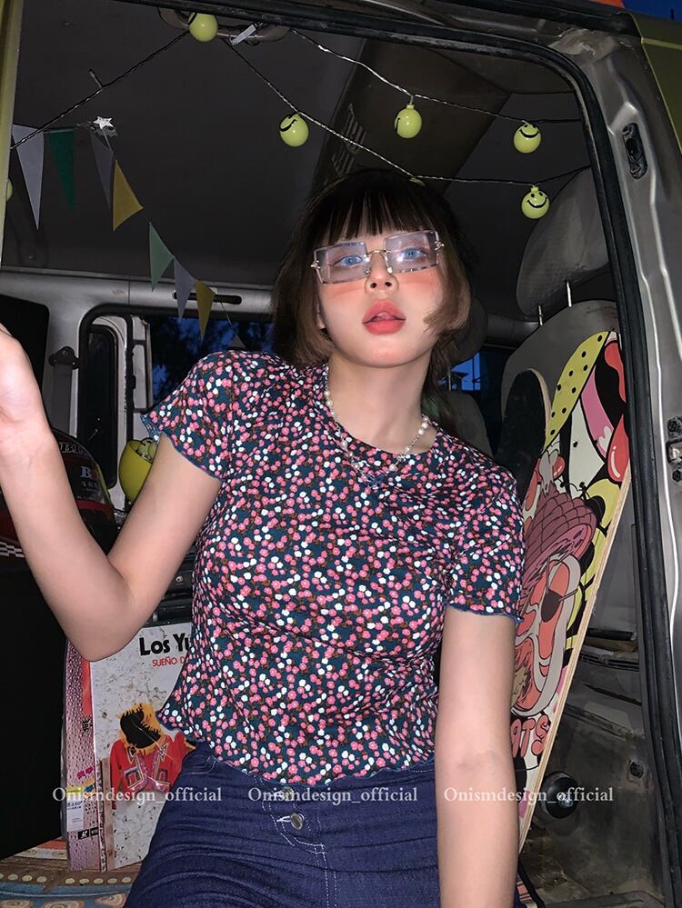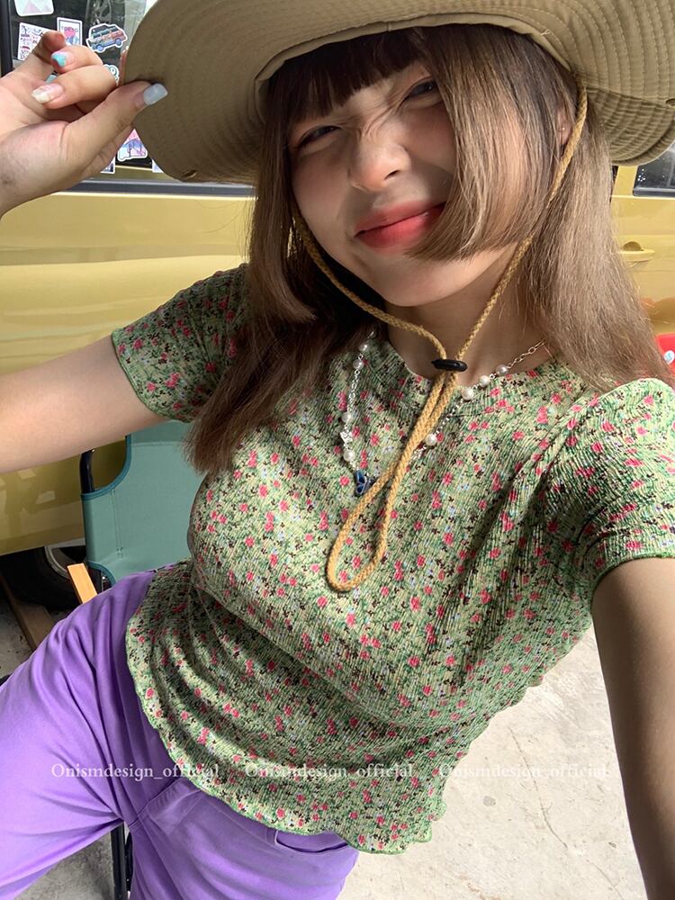 スタンダードフローラルショートTシャツ サマースリム薄手ラウンドネック レトロ 夏物 花柄 Oネック ビッグFスモールZ韓国76907341624