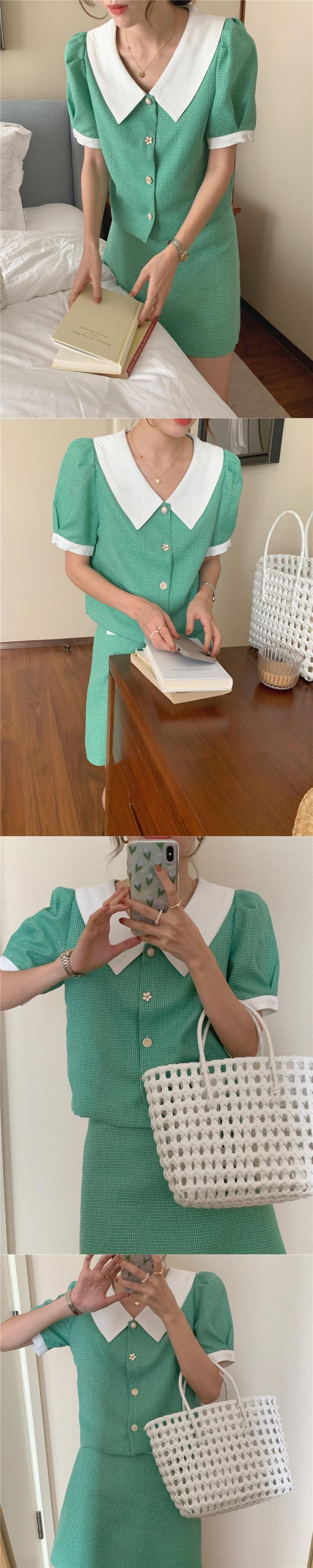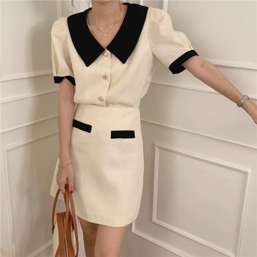 カラーブロックスリーブスタイルシャツ サマースリムショートスカート セット 夏物 ビッグFスモールZ韓国18452467983