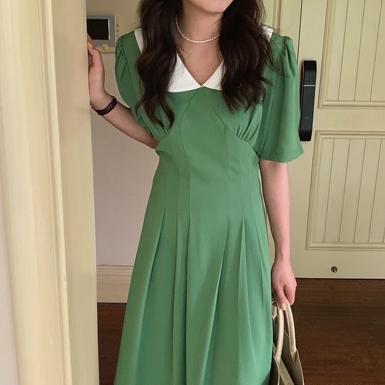 カラーウェストドレス サマースタイルスリーブプリーツAラインロングスカート 夏物 ビッグFスモールZ韓国30544838881