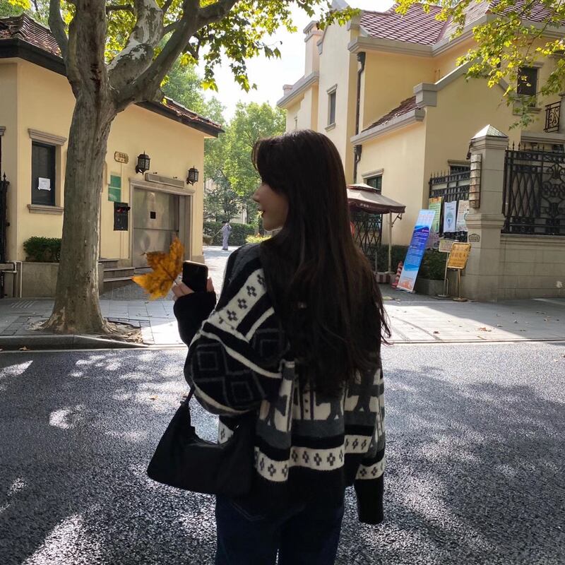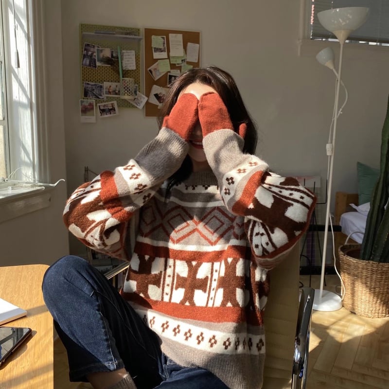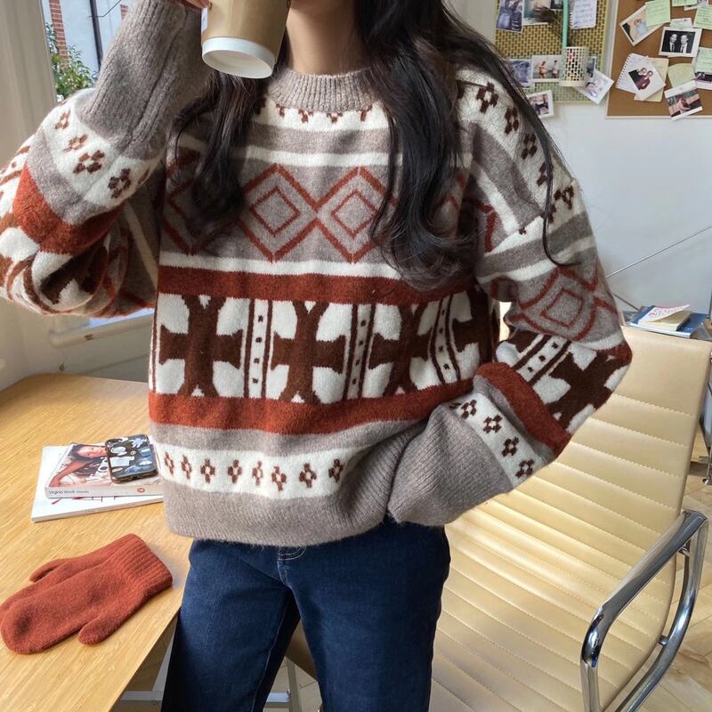 ジャカードセーター ルーズラウンドネックパターンプルオーバー ニットトップス レディース Oネック ビッグFスモールZ韓国37045485087