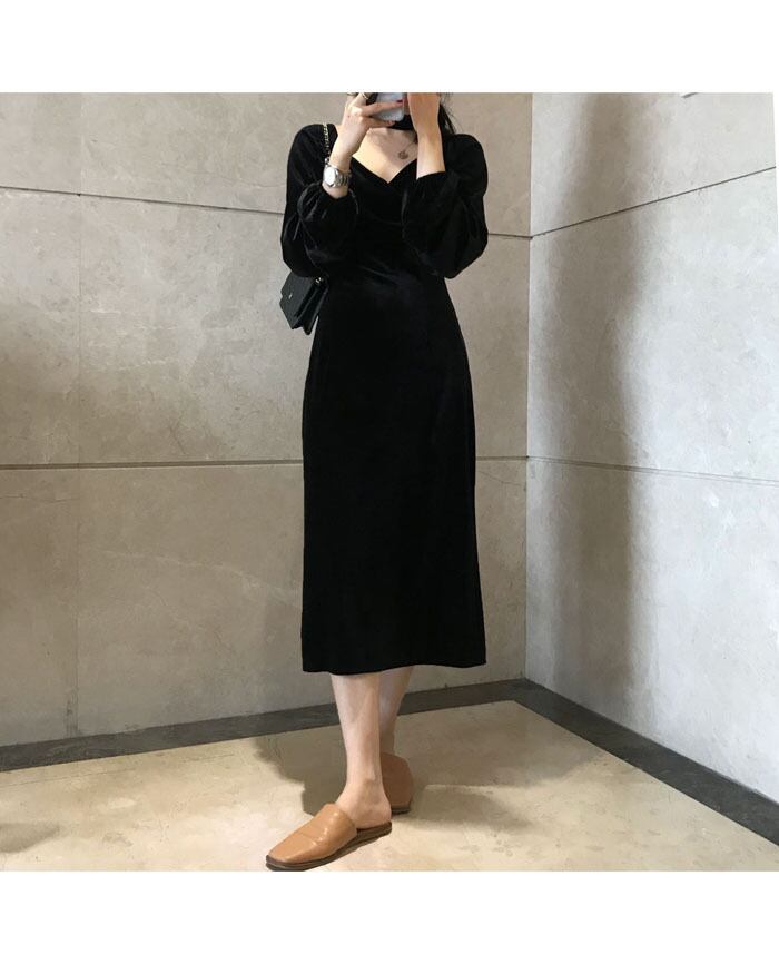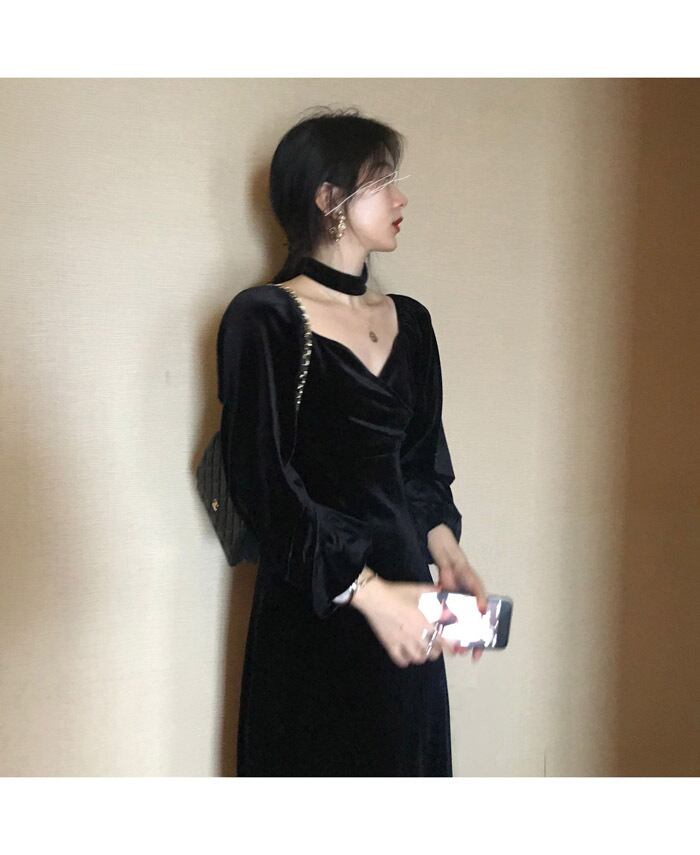 スタンダードベルベットドレス カラーブラック レトロ ビッグFスモールZ韓国513334218
