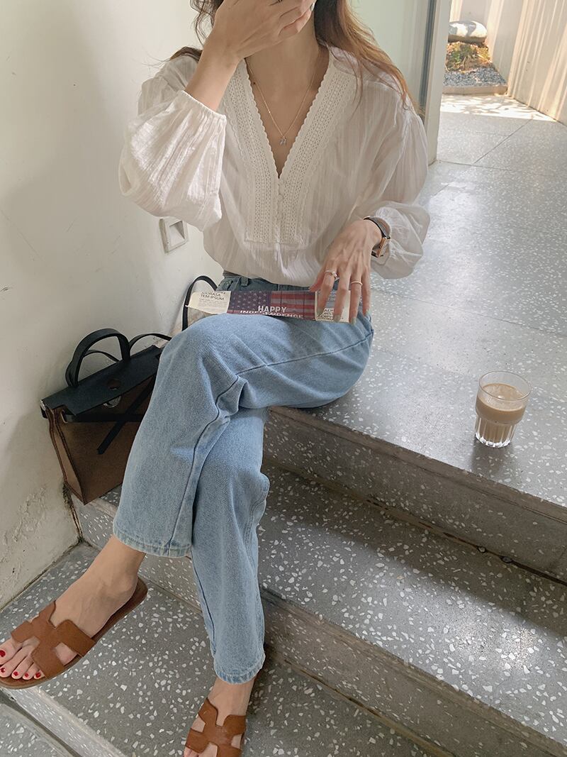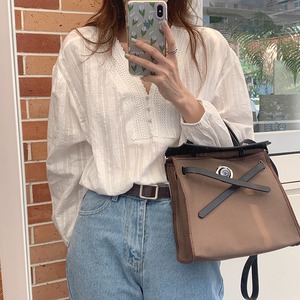 ソリッド カラーストライプシャツ トップス オータム薄手ルーズVネックホワイト ロング 秋物 ソリッドカラー ビッグFスモールZ韓国9958309160