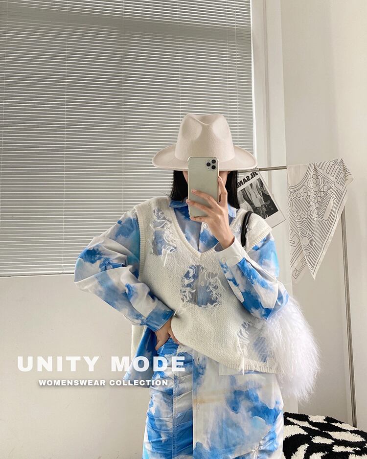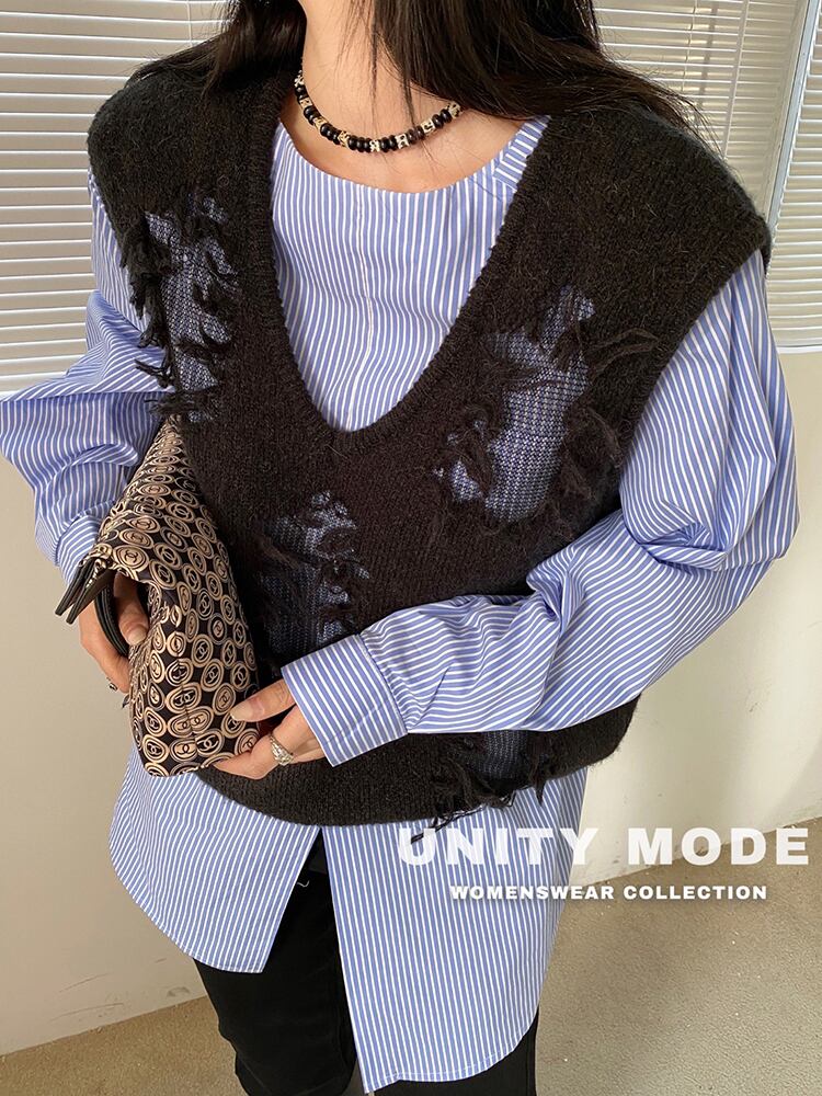 ニットオータムルーズVネックノースリーブソリッド カラー ストリート 秋物 ソリッドカラー ビッグFスモールZ韓国43134898675