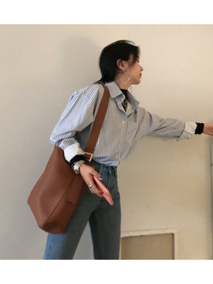 ルーズポケットストライプシャツ 長袖スリーブトップス レディース ロング ビッグFスモールZ韓国8703353797
