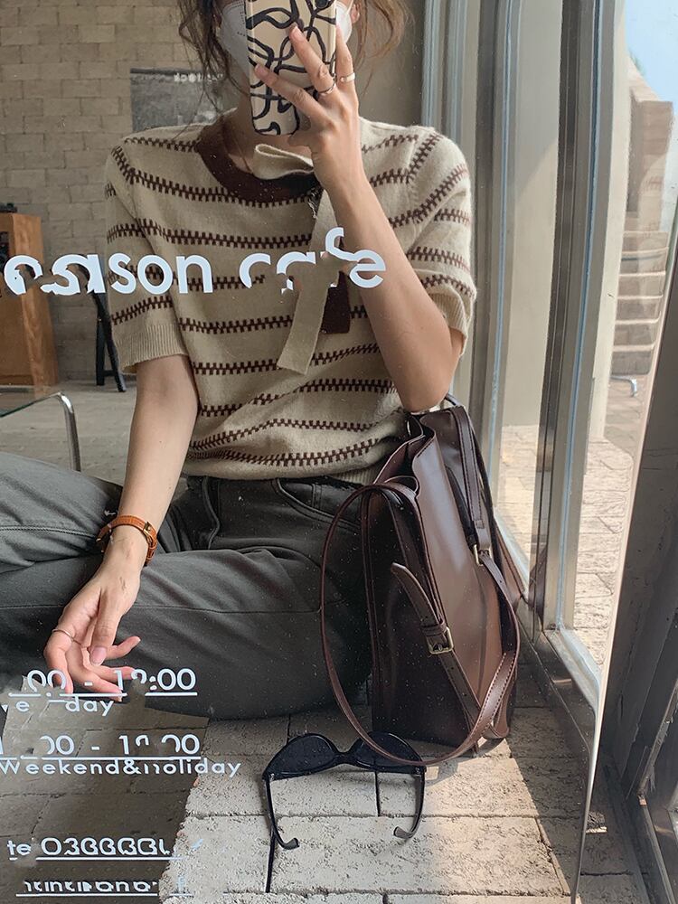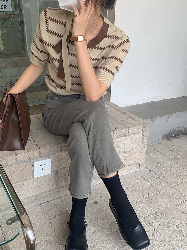ニットオータムスタンダードスタイルストライプラウンドネックトップス リボン レトロ 秋物 Oネック ビッグFスモールZ韓国12138445014