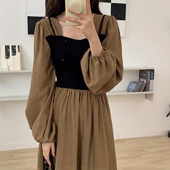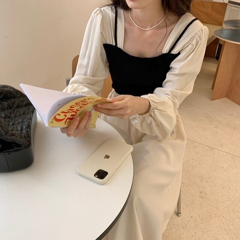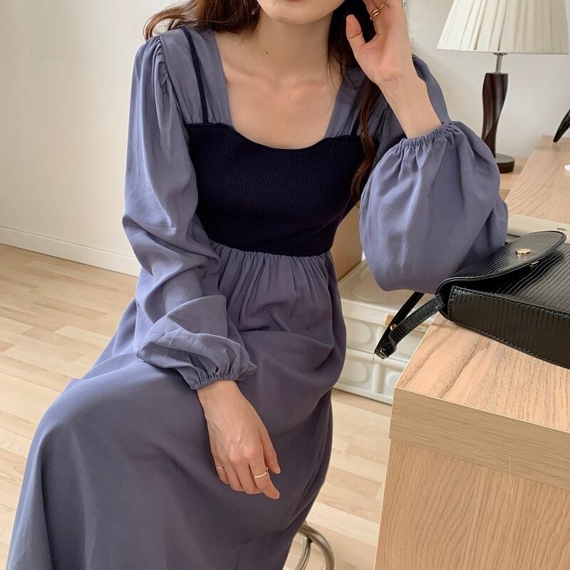 ドレス オータム薄手カラーミディ ロング 秋物 スクウェア ステッチ ビッグFスモールZ韓国67183684088