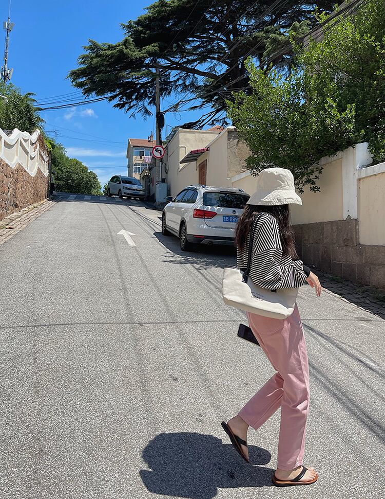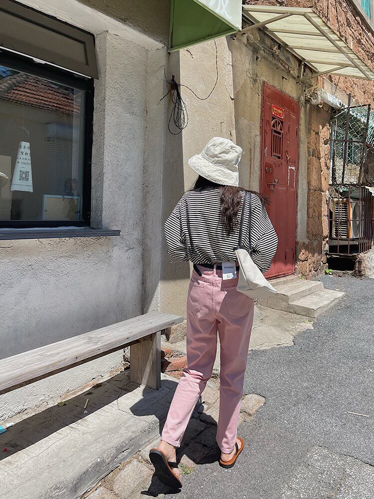 ルーズジーンズ レディースオータムハイウェスト薄手ロングパンツ ピンク 秋物 ビッグFスモールZ韓国60388899667