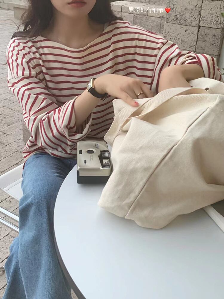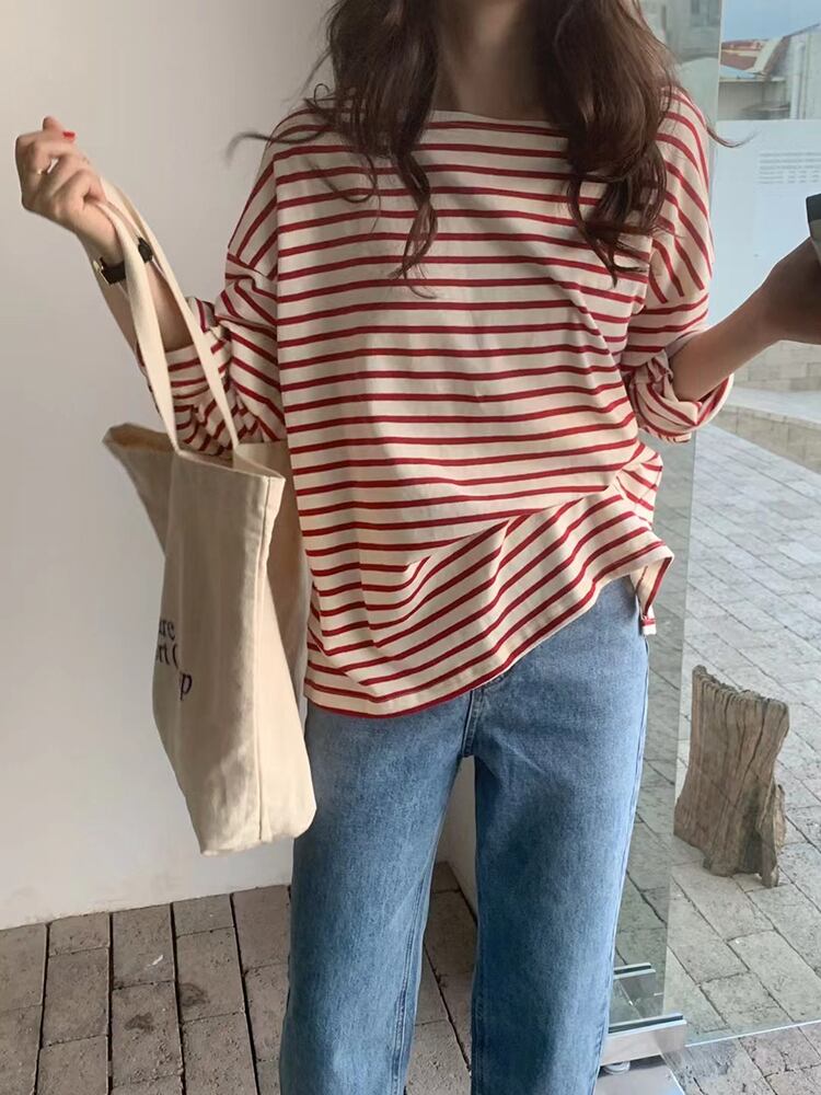 ディテイルドストライプオータムシャツ ロング ストリート 秋物 Oネック Tシャツ ビッグFスモールZ韓国20627560931