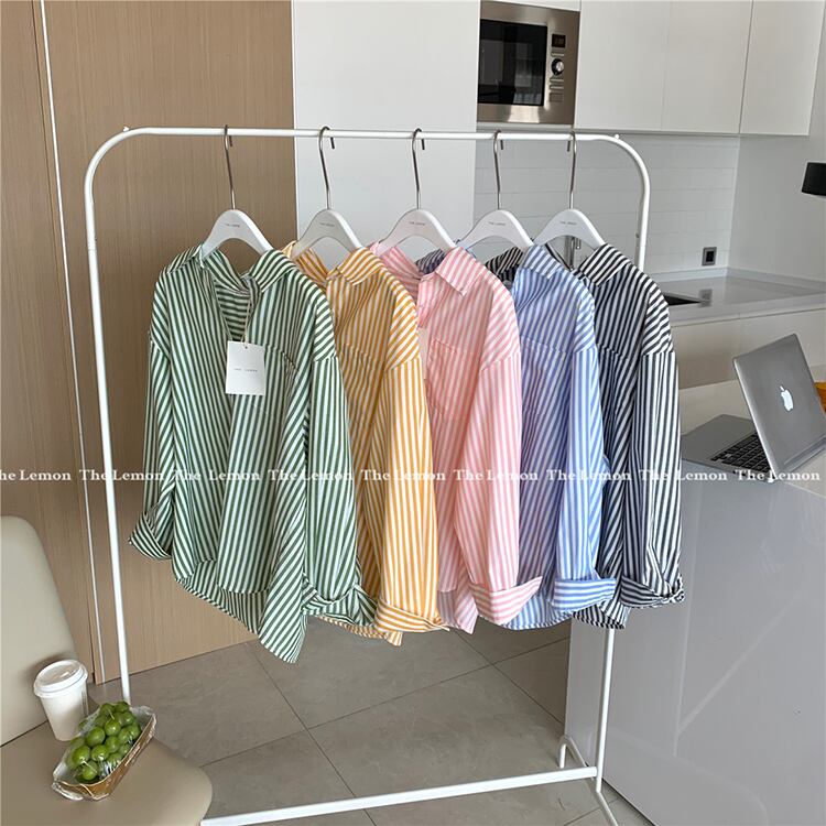ストライプカラーシャツ オータムルーズ薄手 ロング レッド 秋物 ビーチ ビッグFスモールZ韓国97970381703