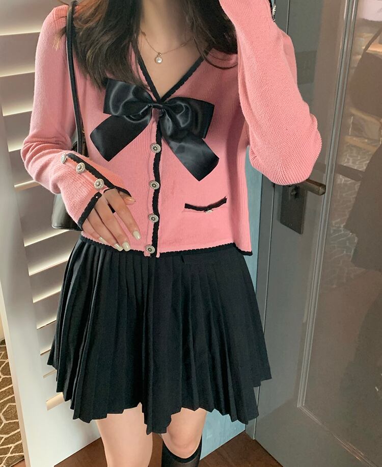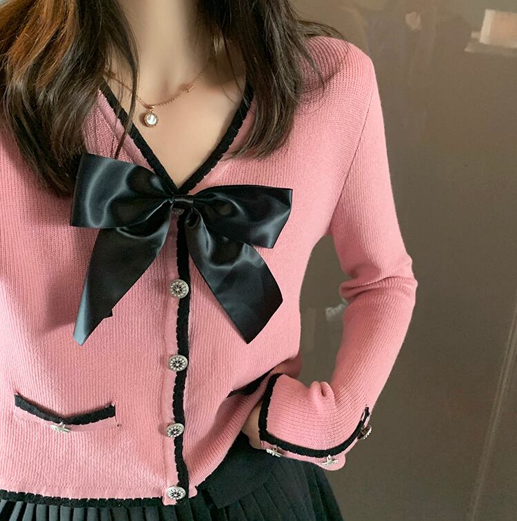 セーター レディーススプリングオータムショート長袖スリーブVネック ロング リボン 春物 秋物 ビッグFスモールZ韓国23030363010