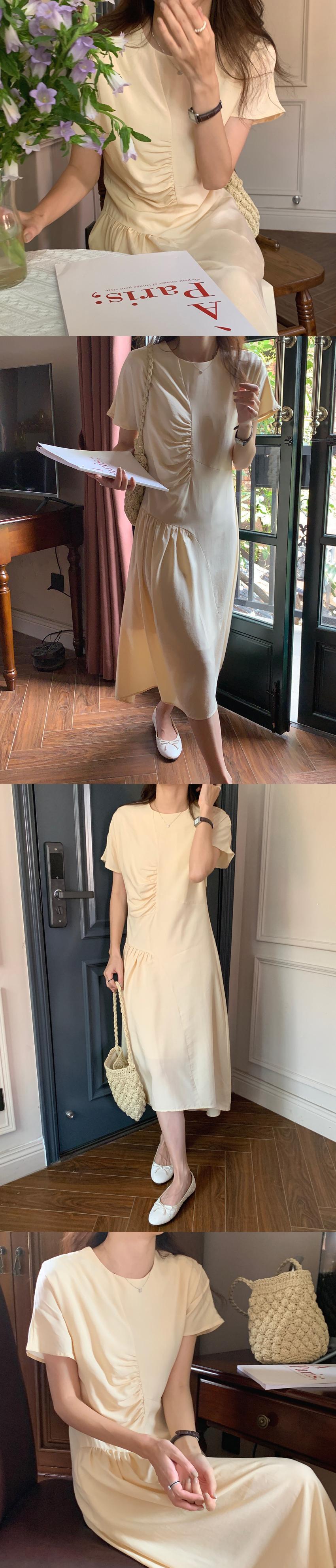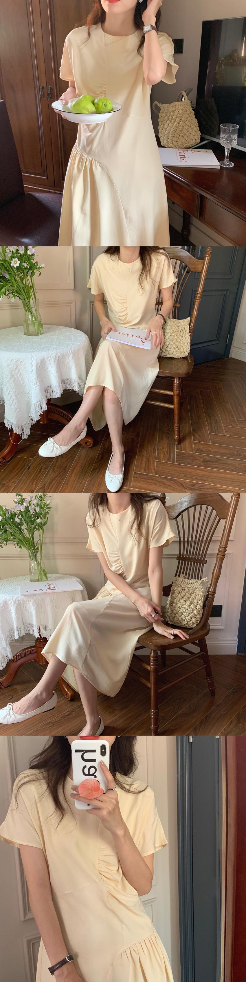 プリーツラウンドネックドレス サマースタイル薄手ウェストソリッド カラーAラインスカート 夏物 Oネック ソリッドカラー ステッチ ビッグFスモールZ韓国86785893832