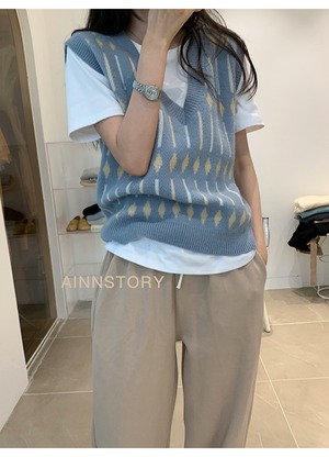 オータムルーズVネックノースリーブセーター レディースニット 秋物 ビッグFスモールZ韓国20691792977