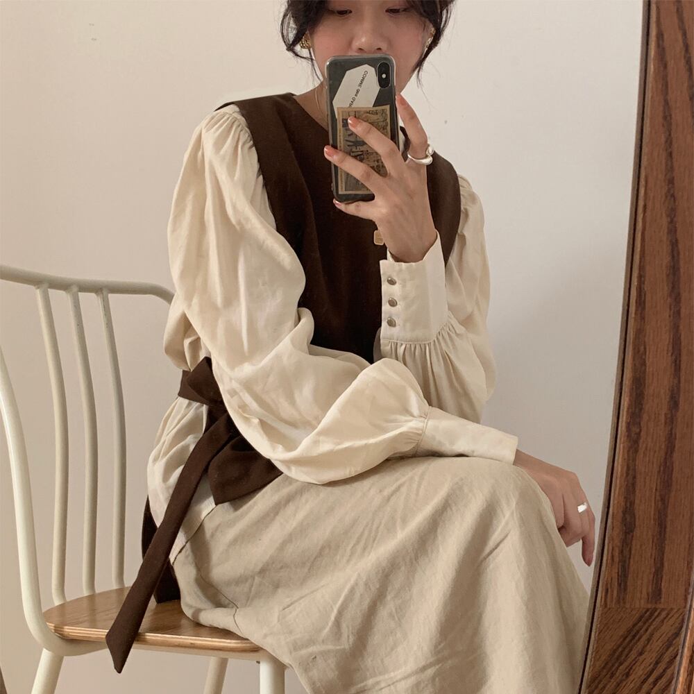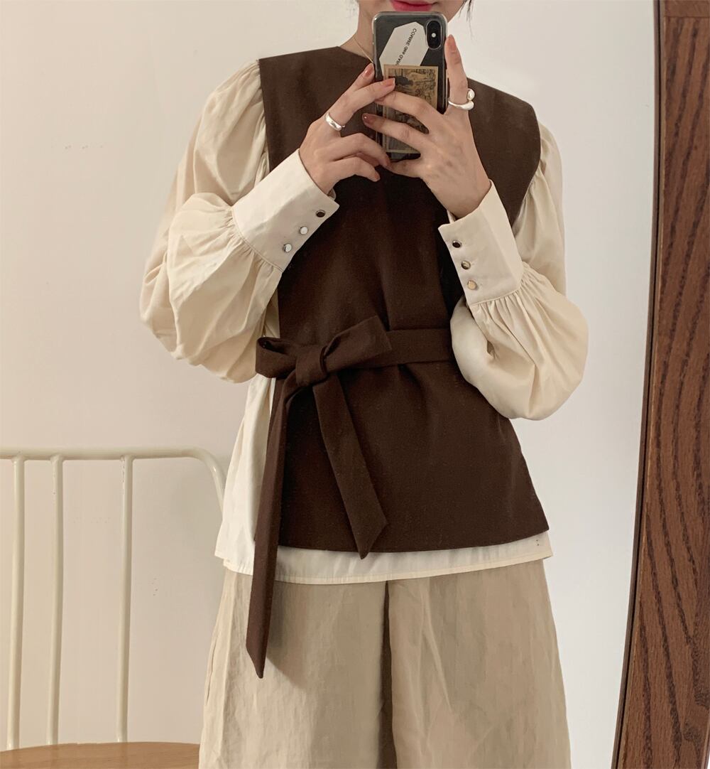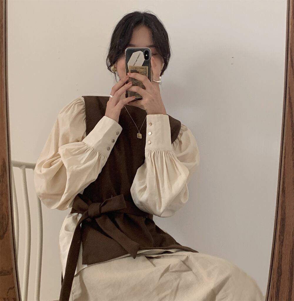 スタンダード長袖スリーブシャツ レースノースリーブ ロング リボン レトロ ビッグFスモールZ韓国13312005058