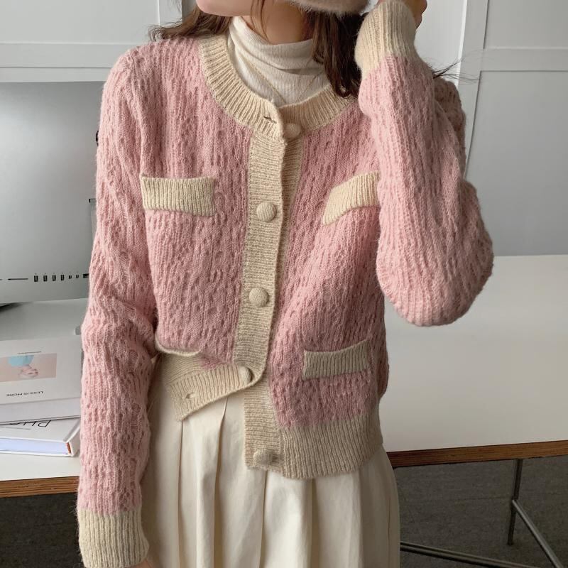 ラウンドネックカーディガンジャケット スタンダードオータムニット長袖スリーブトップス ロング レトロ 秋物 Oネック ビッグFスモールZ韓国82356800686