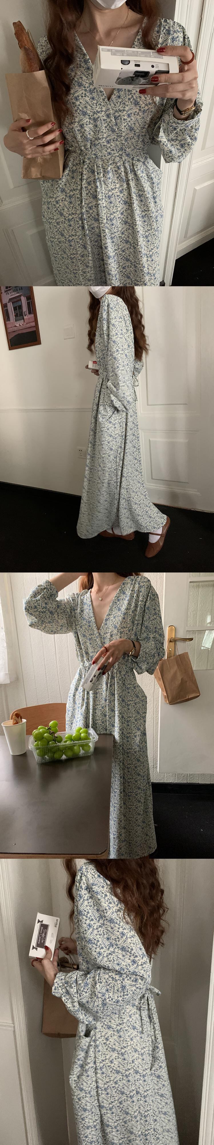 フローラルドレス レディースオータムスタンダードルーズウェストVネック長袖スリーブスカート ロング レトロ レース 秋物 花柄 レースアップ ビッグFスモールZ韓国14293619066