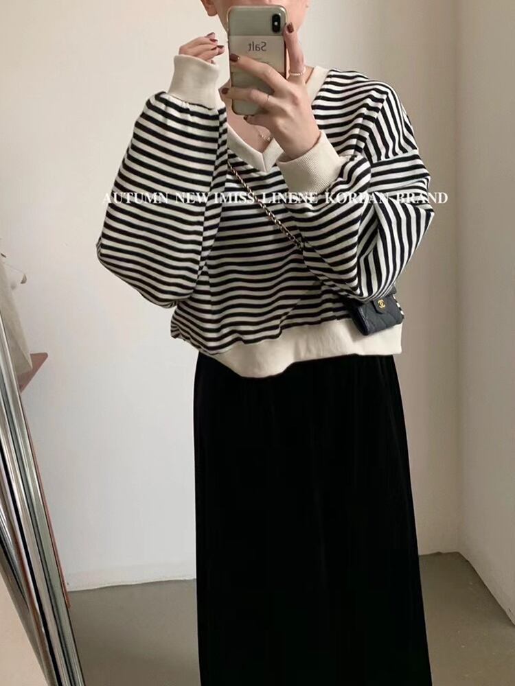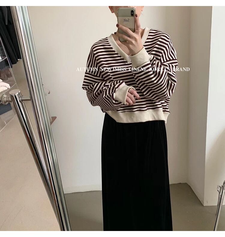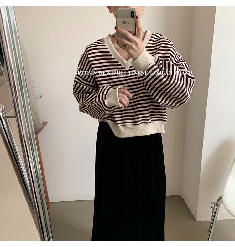 Vネックストライプセーター レディースオータムルーズ薄手プルオーバー トップス ロング 秋物 ビッグFスモールZ韓国71883544608