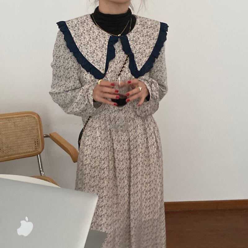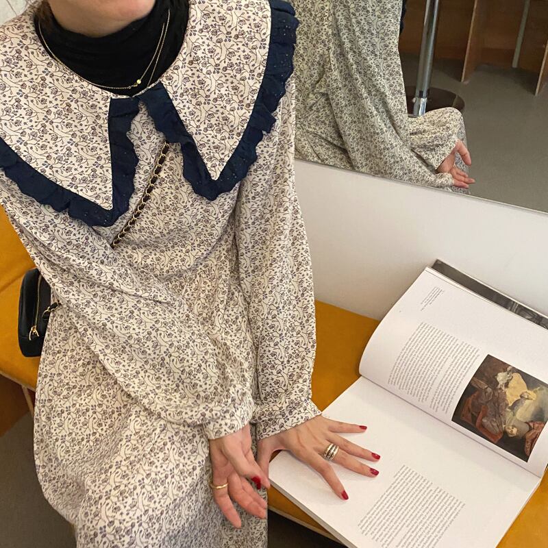 スタンダードプリント柄ドレス オータムウィンターロングスカート レトロ 秋物 冬物 ビッグFスモールZ韓国66615387392