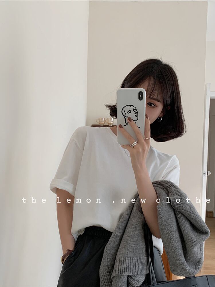 ホワイトラウンドネックTシャツ オータムルーズソリッド カラートップス 秋物 Oネック ソリッドカラー ビッグFスモールZ韓国18722487039