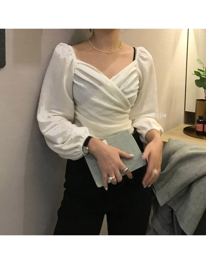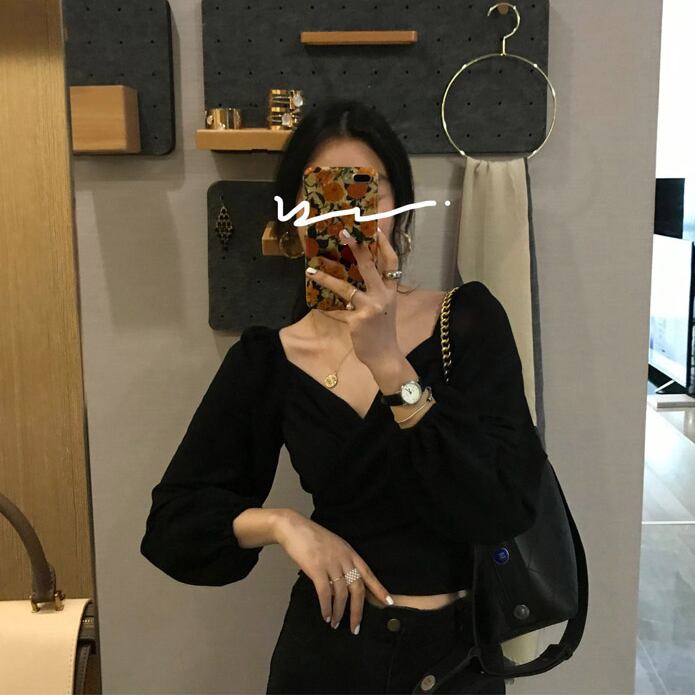 スタンダードVネックスリーブベルベットシャツ スリムショートトップス レディース レトロ レース ビッグFスモールZ韓国51763729474