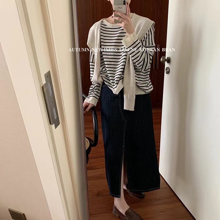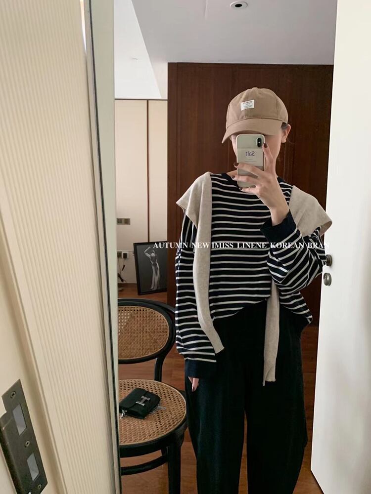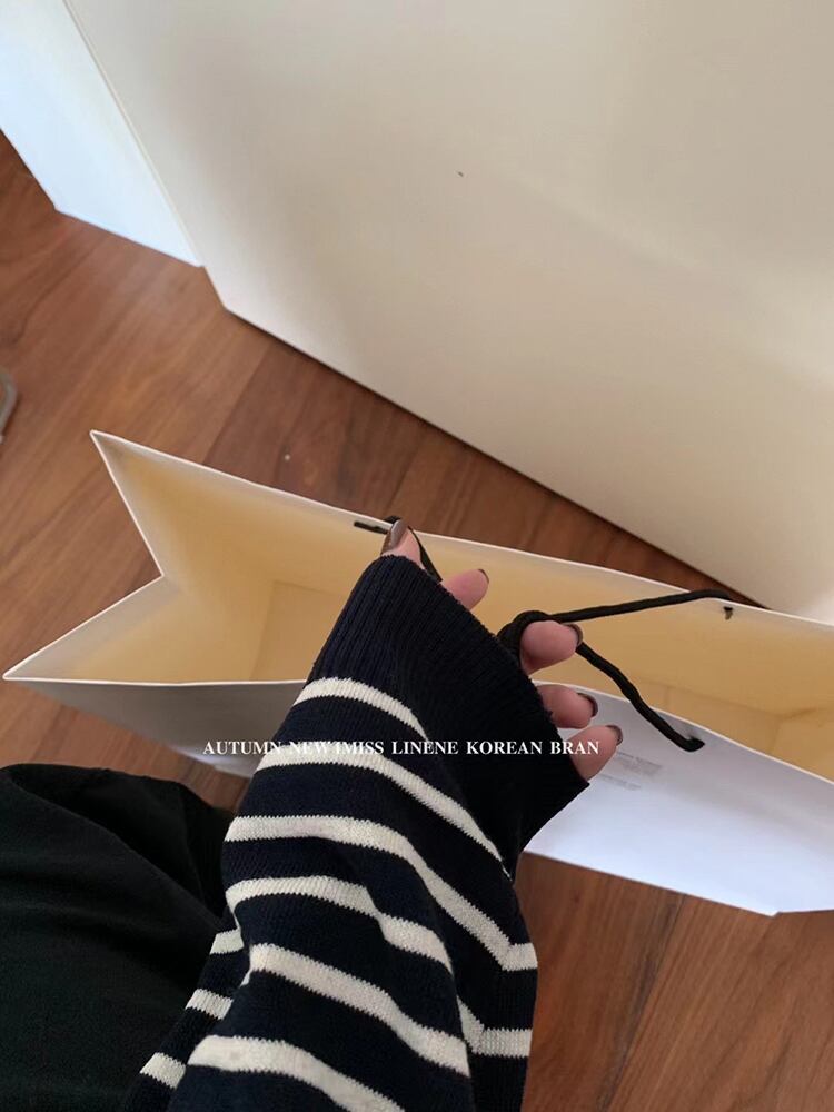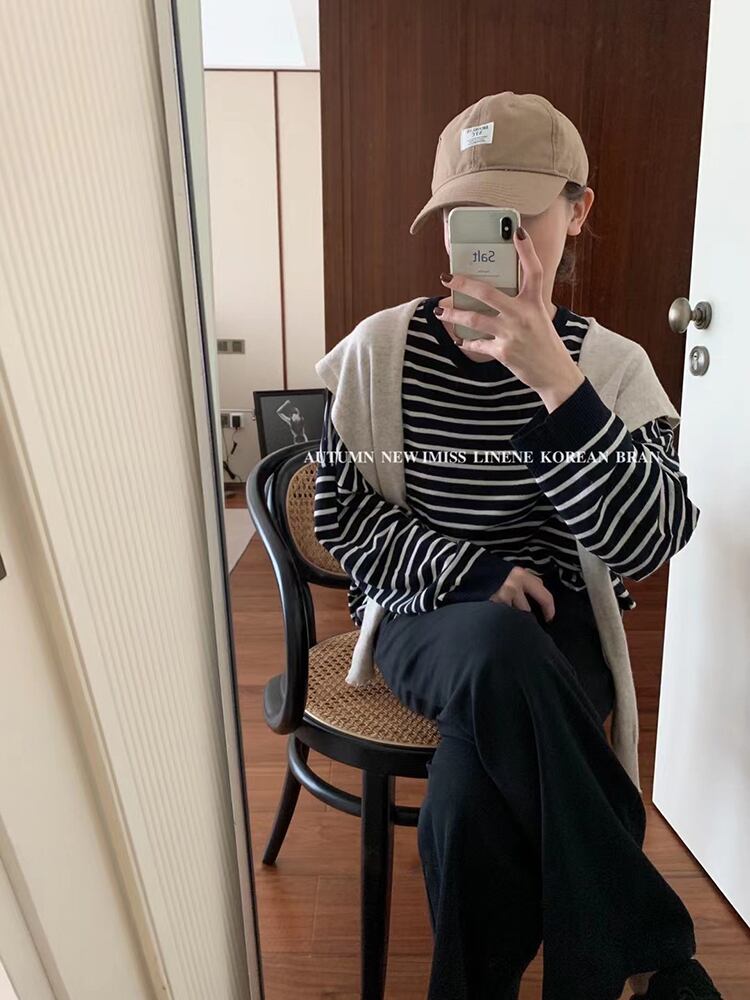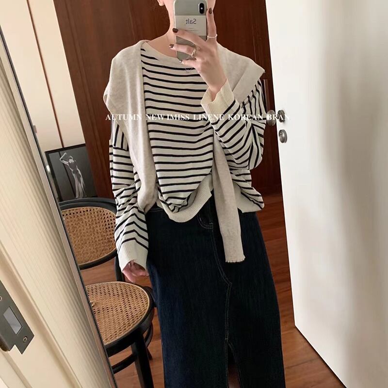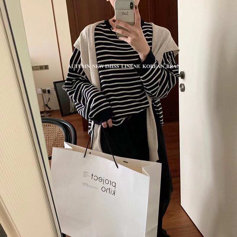 ストライプセーター トップス ラウンドネックプルオーバー ルーズ Oネック ビッグFスモールZ韓国44010268107