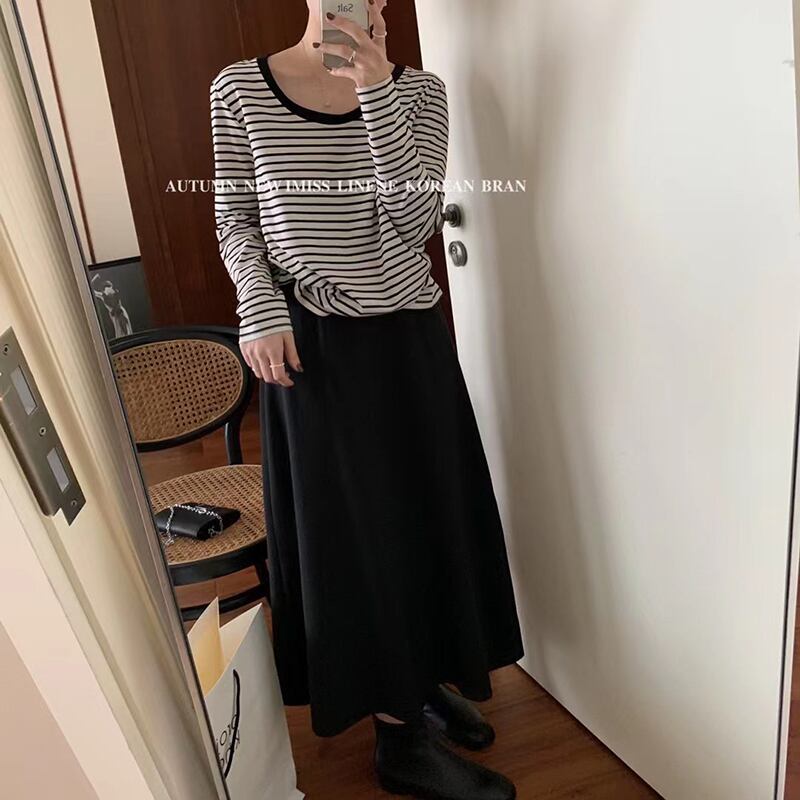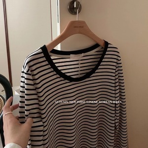 ストライプラウンドネック薄手オータムカジュアルルーズTシャツ ロング 秋物 Oネック ビッグFスモールZ韓国30188560863