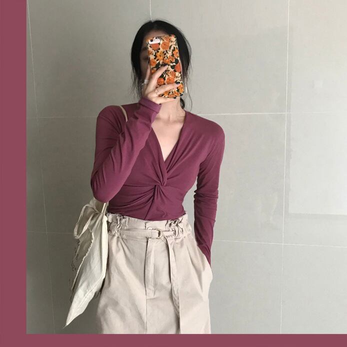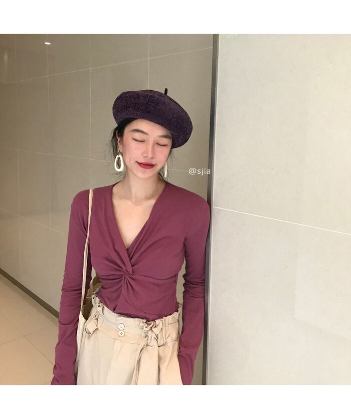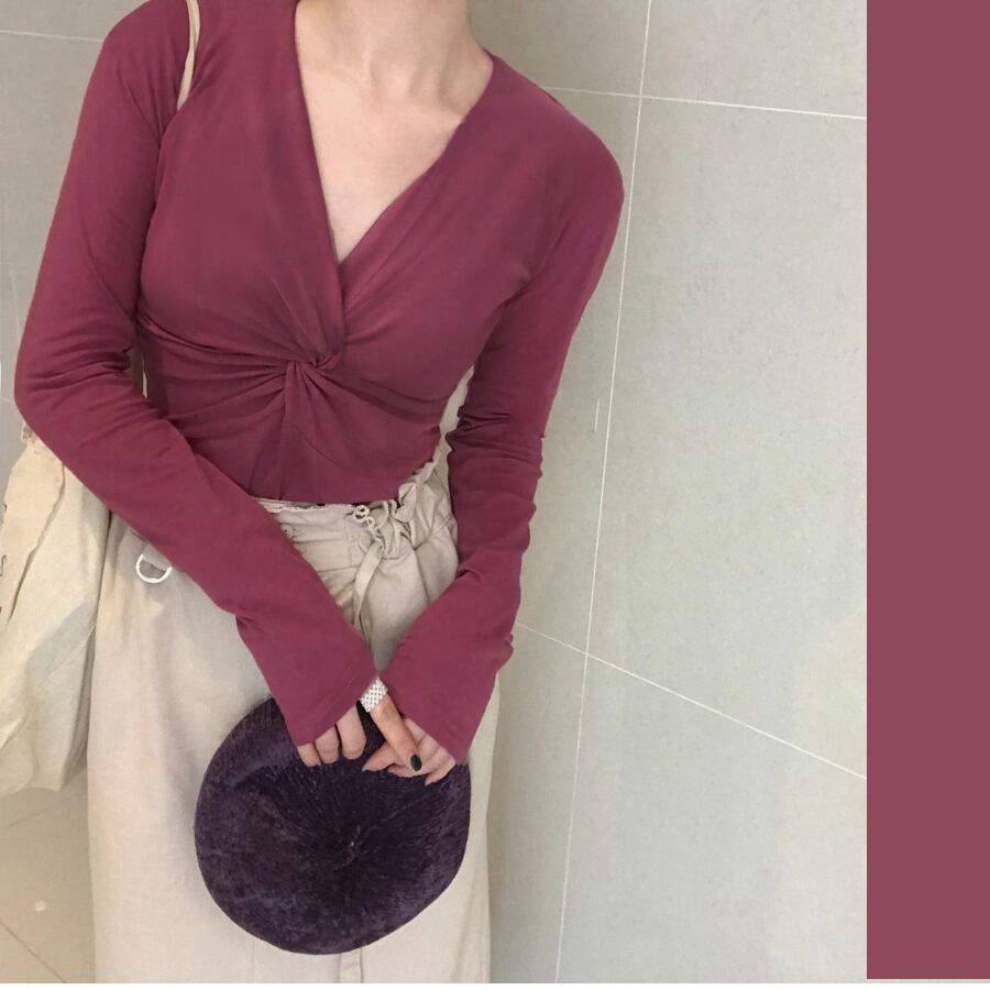 ボタンVネックTシャツ トップス レディース ロング パープル ビッグFスモールZ韓国31380416483