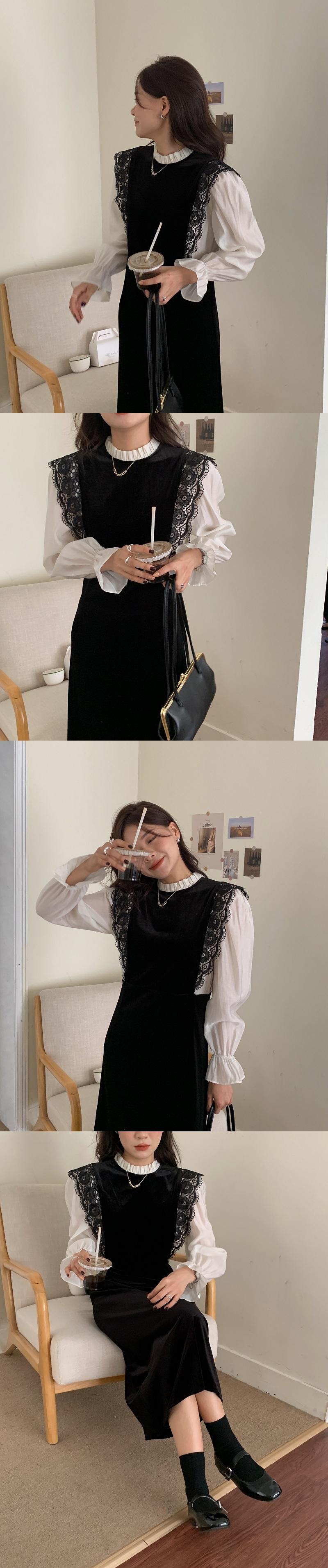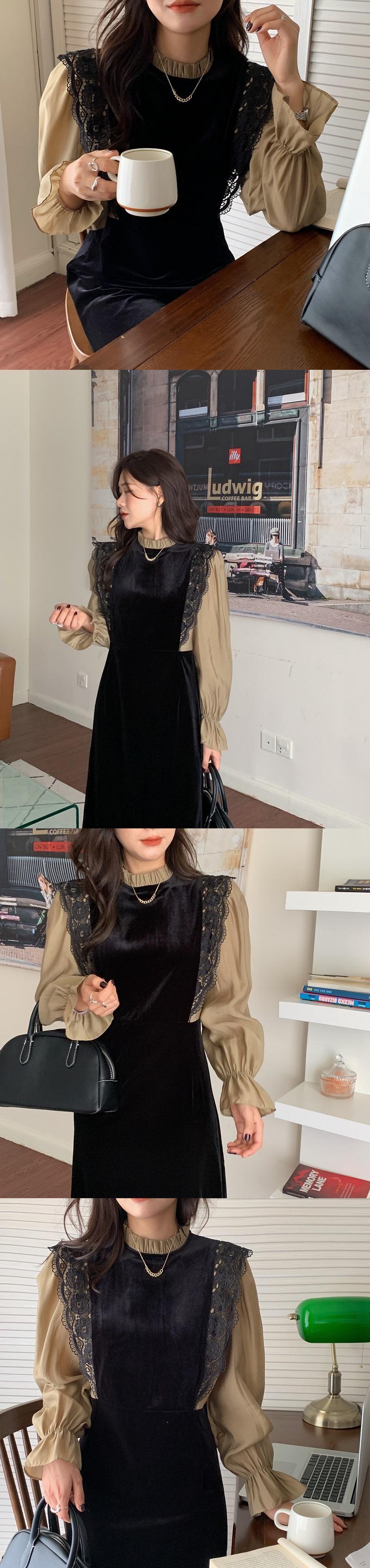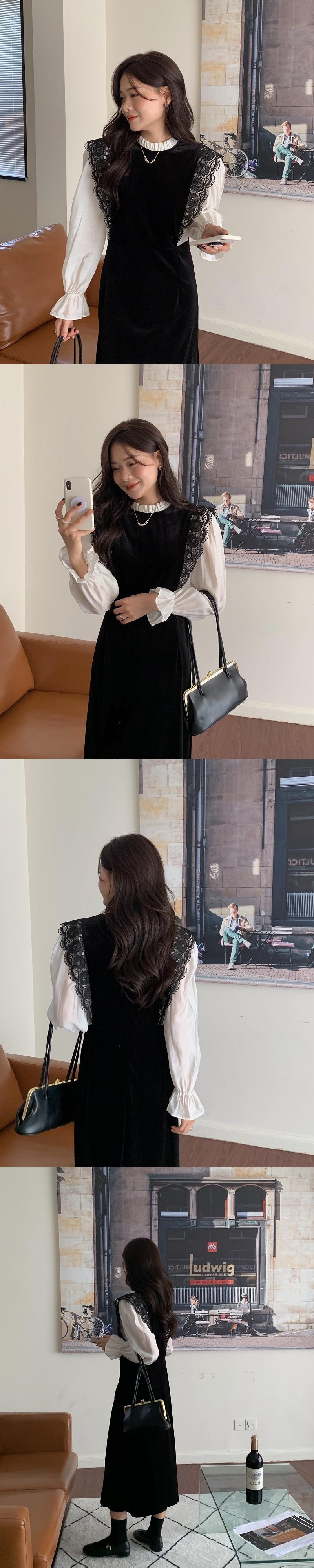 ベルベットドレス オータムスタンダードレースハイウェストウェスト ロング レトロ 秋物 ステッチ ビッグFスモールZ韓国6216134970