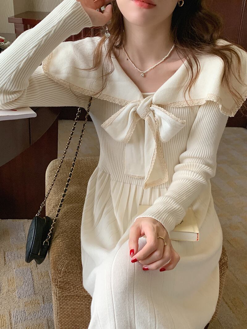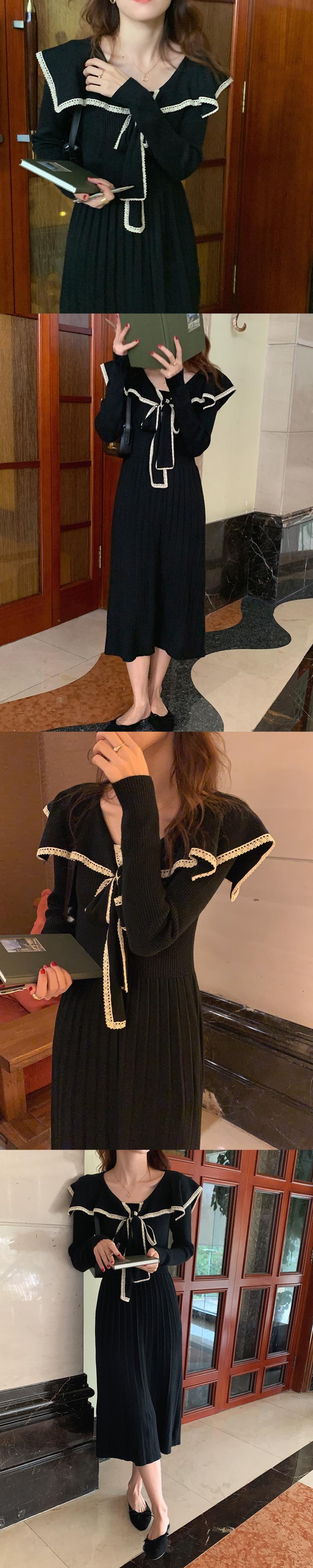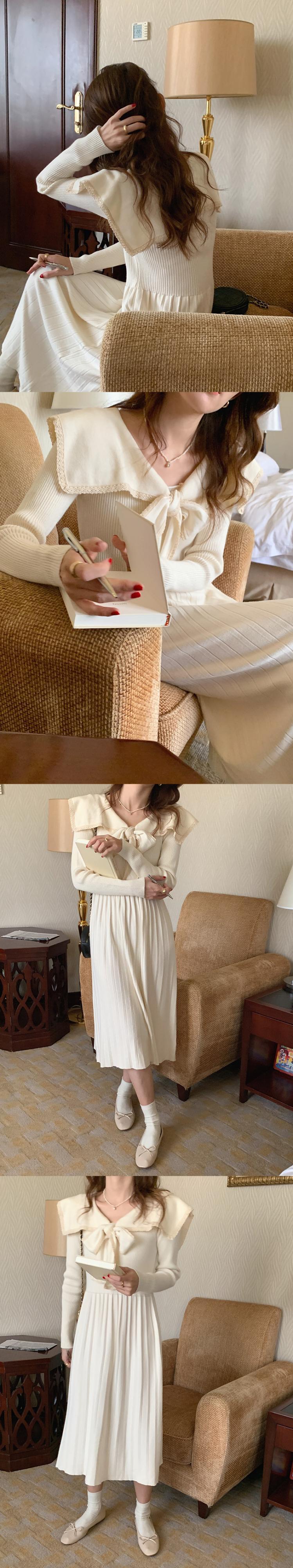 ニットプリーツドレス オータムカラースリム 秋物 ステッチ ビッグFスモールZ韓国88830296879