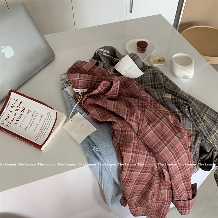 格子柄カラーシャツ オータム長袖スリーブトップス ロング 秋物 ビッグFスモールZ韓国73145637452