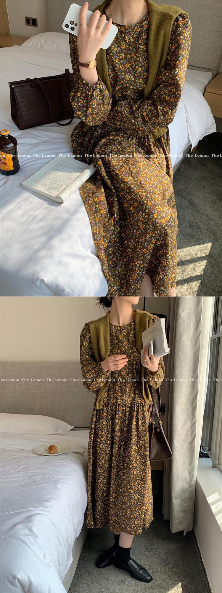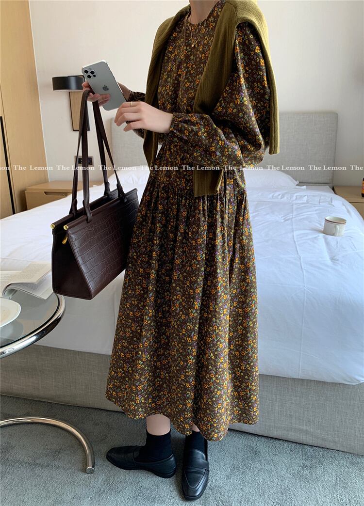 フローラルスカート ドレス オータムウェストラウンドネック ロング 秋物 花柄 Oネック ビッグFスモールZ韓国52152490865