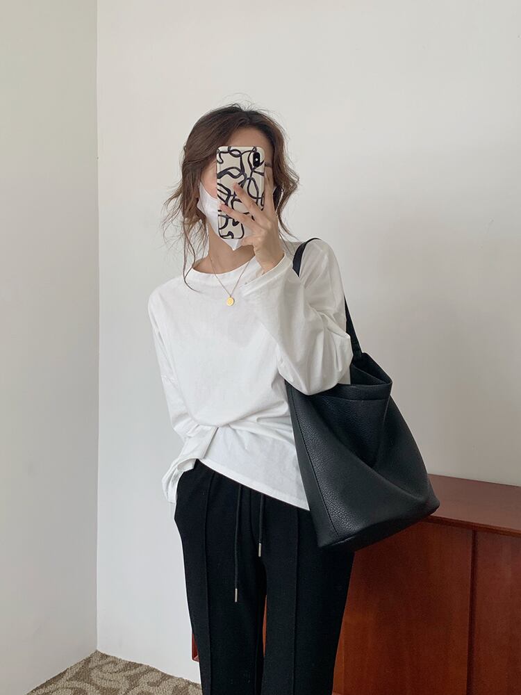 ホワイトスリーブTシャツ シャツ オータムスタイルルーズ薄手ラウンドネック ロング 秋物 Oネック ビッグFスモールZ韓国31257883097